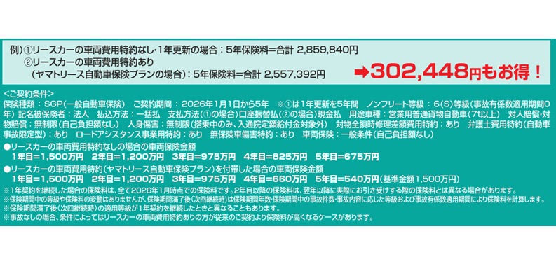 保険料は、毎月のリース料に含まれますので車両に関する費用が一本化でき、かつ平準化されます!また、保険期間がリース期間と合わせられるため毎年の保険契約の手続きが無くなります。